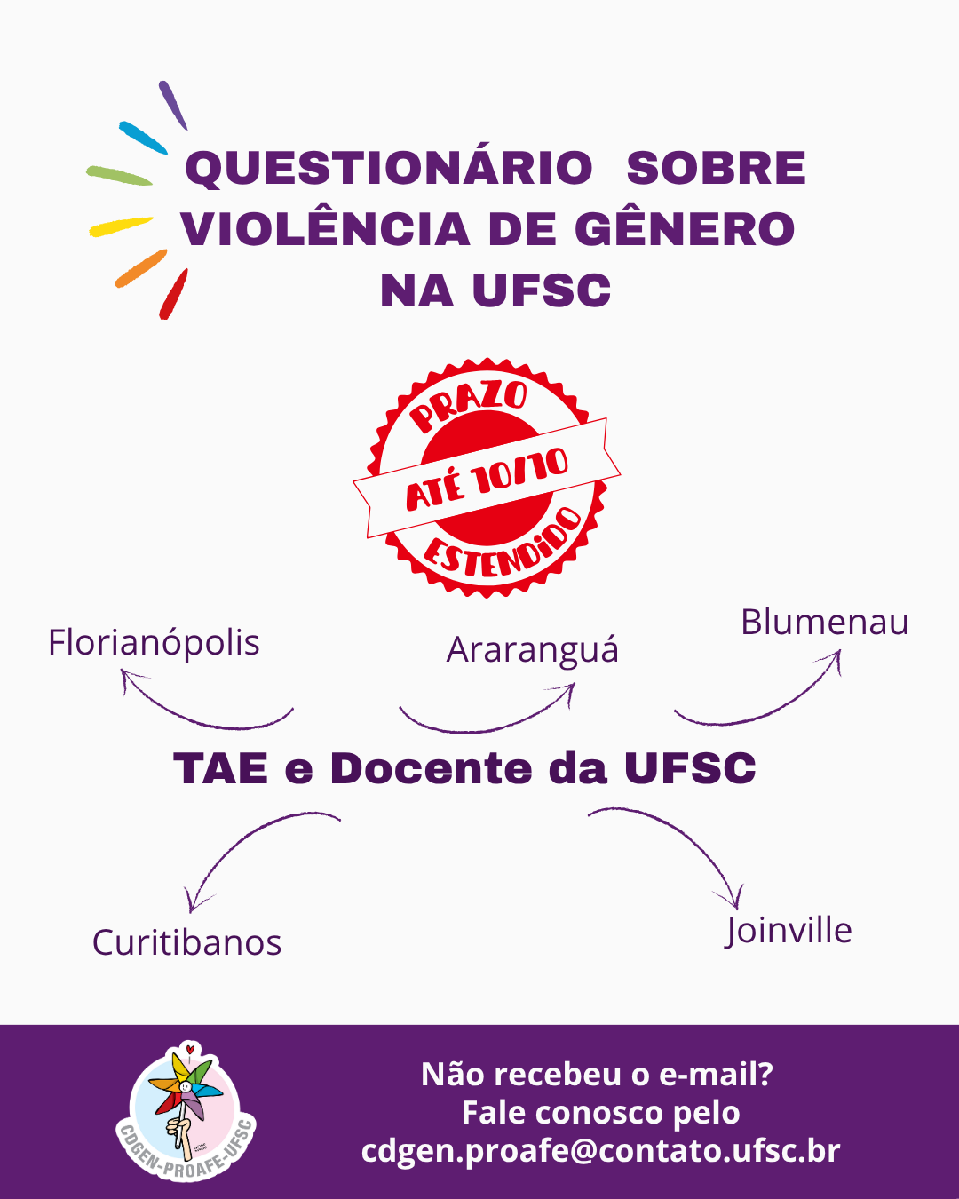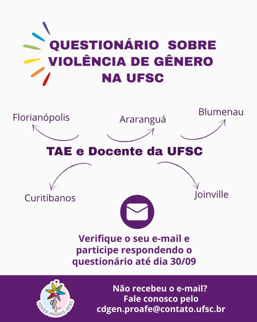 A participação é anônima, leva apenas alguns minutos e terá papel fundamental na construção de políticas e ações de prevenção, acolhimento e promoção da equidade de gênero na UFSC. Caso não tenha recebido o link, nos envie um e-mail: cdgen.proafe@contato.ufsc.br